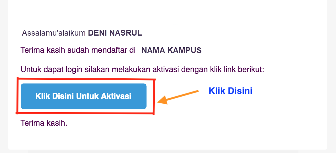 - Selanjutnya buka email aktivasi yang Anda terima, akan muncul halaman aktivasi sebagai berikut