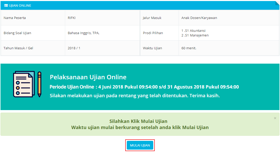 3. Bila jadwal ujian online sudah mulai, silakan memulai ujian online. Langkah-langkahnya adalah sebagai berikut: